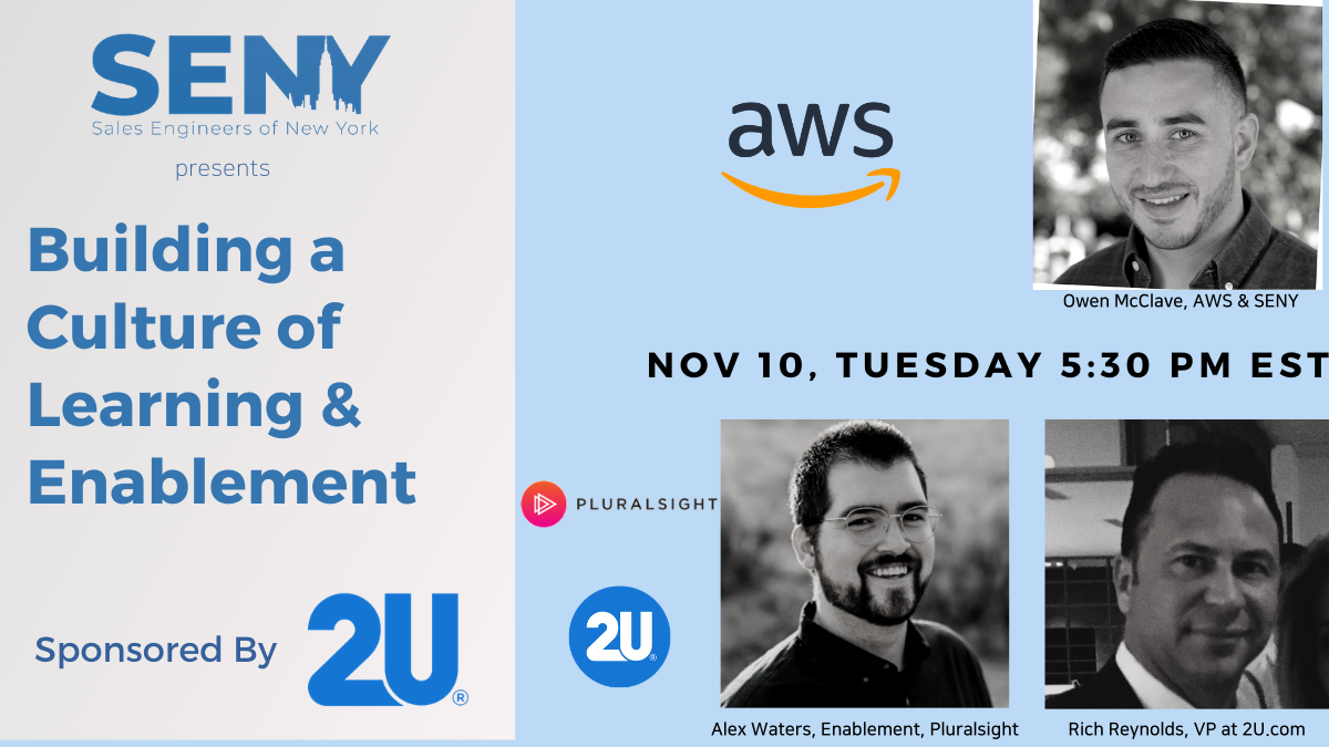 Sales Engineers of New York (SENY) and our sponsor 2U invite you to our fall event, focused on enablement for your SEs. This event features leaders from AWS, 2U and Pluralsight where the focus will be on learning about how to enable your presales teams to always deliver to the best of their abilities. The event will be moderated by SENY co-founder and SA Manager at AWS, Owen McClave who will be speaking with Mary Wallace (SA Director, Northeast), Rich Reynolds (VP, 2U) and Alex Waters (Enablement at Pluralsight).